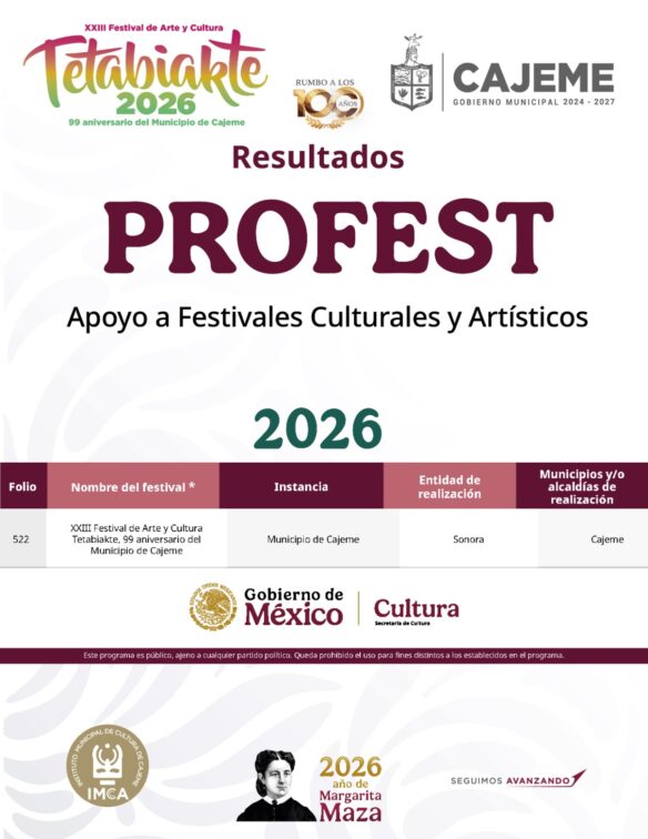 Gracias a las gestiones del Gobierno de Cajeme que encabeza el Alcalde Javier Lamarque, el Ayuntamiento a través del IMCCA, logró obtener un recurso especial por parte del Gobierno Federal de 700 mil pesos, destinado a fortalecer la edición 2026 del Festival Tetabiakte, uno de los eventos culturales más importantes del Sur de Sonora.