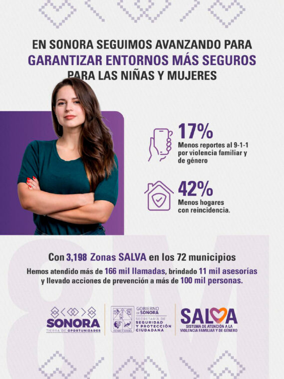 Hermosillo, Sonora; 9 de marzo de 2026.– La seguridad y el bienestar de las mujeres es una prioridad para la Secretaría de Seguridad y Protección Ciudadana (SSPC) Sonora. Por ello, el Sistema de Atención a la Violencia Familiar y de Género (SALVA) sigue trabajando en coordinar acciones de prevención, atención y seguimiento con el objetivo de fortalecer entornos más seguros y libres de violencia.