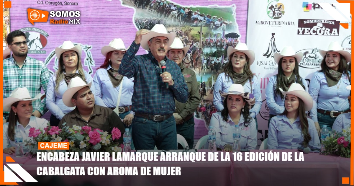 El Presidente Municipal de Cajeme, Javier Lamarque, dio el banderazo de salida de la 16 edición de la Cabalgata con Aroma de Mujer, en la que participaron cientos de mujeres y hombres a caballo, reafirmando esta tradicional actividad que promueve la convivencia familiar, el respeto a nuestras raíces y el fortalecimiento del tejido social.