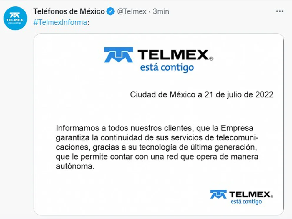 Por su parte, la compañía de telecomunicaciones aseguró que está garantizada la continuidad de todos sus servicios debido a su tecnología de última generación, que le permite contar con una red que opera de manera autónoma.