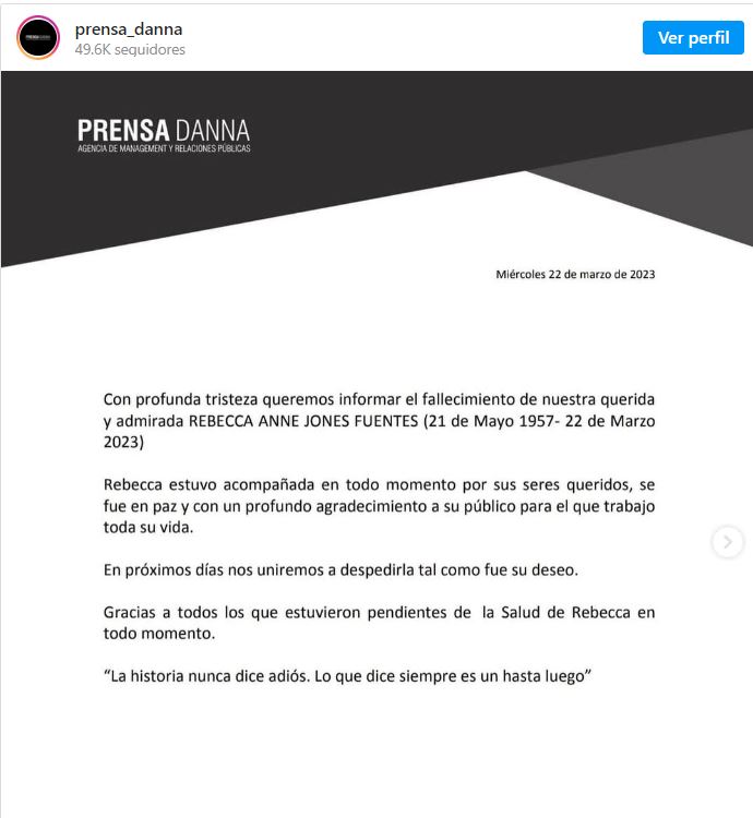 «Con profunda tristeza queremos informar el fallecimiento de nuestra querida y admirada REBECCA ANNE JONES FUENTES (21 de Mayo 1957- 22 de Marzo».