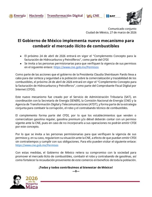 El Gobierno de México anunció la entrada en vigor del “Complemento Concepto para la facturación de Hidrocarburos y Petrolíferos”, con el objetivo de combatir el mercado ilícito de combustibles.