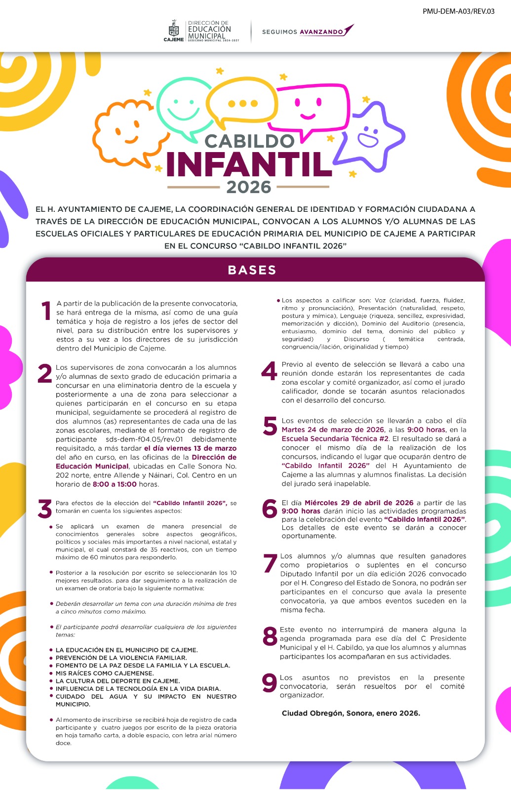 Con el objetivo de fomentar la participación ciudadana desde la niñez y fortalecer el liderazgo infantil, el H. Ayuntamiento de Cajeme, a través de la Dirección de Educación Municipal, convoca al Cabildo Infantil 2026, un ejercicio democrático dirigido a estudiantes de sexto grado de primaria de escuelas públicas y privadas del municipio.