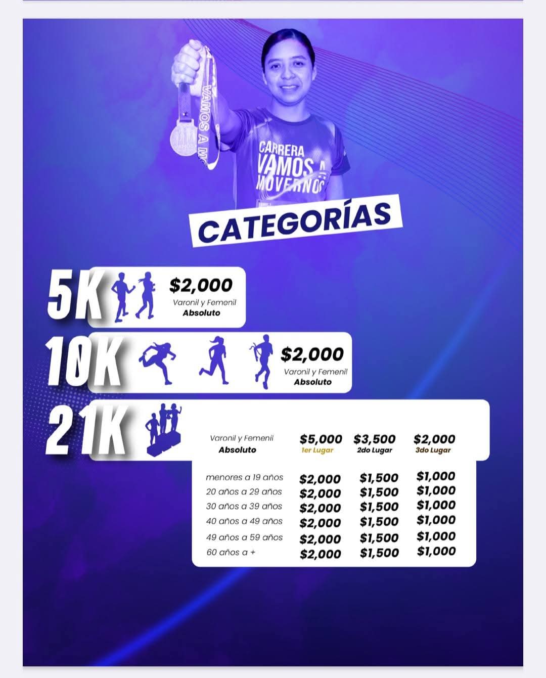 La carrera contempla tres distancias 5, 10 y 21 kilómetros, en categorías varonil y femenil, con premios económicos para los primeros lugares, lo que añade un incentivo extra para las y los participantes.