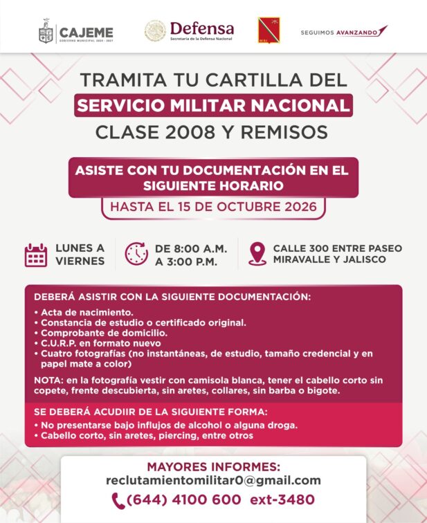 El Gobierno Municipal de Cajeme, a través de la Junta Municipal de Reclutamiento y en coordinación con la Secretaría de la Defensa Nacional, invita a los jóvenes de la Clase 2008, así como a remisos, a realizar el trámite de su Cartilla del Servicio Militar Nacional.