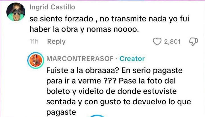 «Fuiste a la obraaaa? En serio pagaste para ir a verme??? Pase la foto del boleto y videito de donde estuviste sentada y con gusto te devuelvo lo que pagaste».