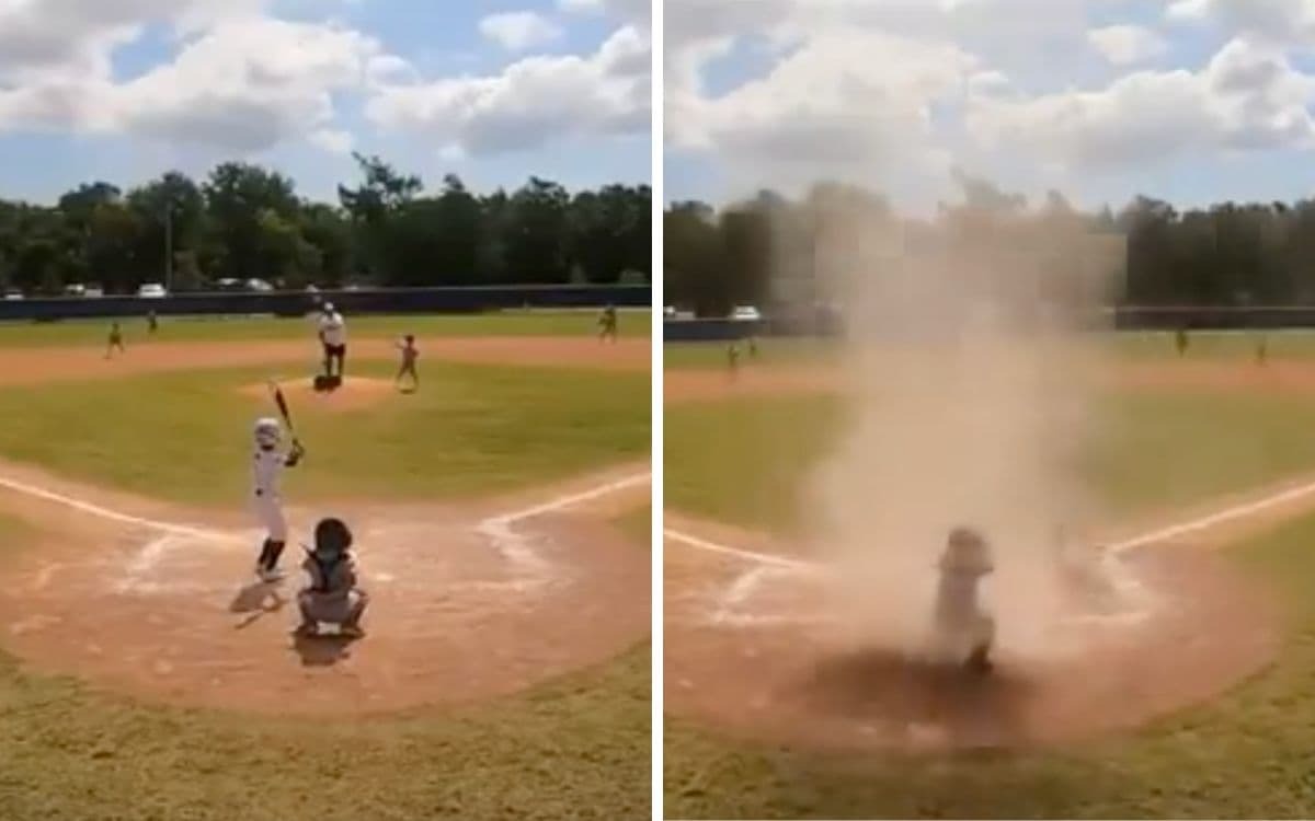 El menor identificado como Zoya se encontraba listo en su posición de cácher cuando súbitamente se lo tragó el remolino. El accidente quedó registrado en video el fin de semana pasado, viralizándose rápidamente en redes sociales.