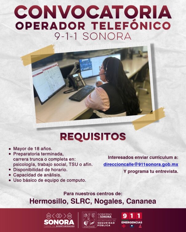 San Luis Río Colorado, Sonora; 6 de octubre de 2025.- Para fortalecer la atención que el Gobierno de Sonora brinda a la ciudadanía que reporta emergencias, la Secretaría de Seguridad Pública (SSP) anunció que ofrece opciones de empleo como Operadores Telefónicos de la Línea 9-1-1 en Hermosillo, San Luis Río Colorado, Nogales y Cananea.