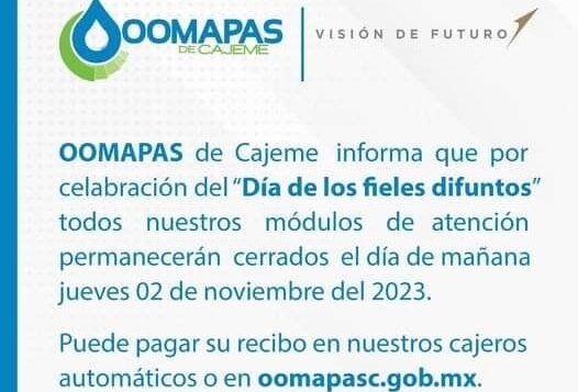 Por Celebración del «Día de los fieles difuntos» los módulos de atención al cliente estarán cerrados el día Jueves 02 de Noviembre, retomando labores el día viernes 03 de noviembre, haciendo saber que ahora se maneja un horario nuevo de atención a cliente de 8am a 3pm de Lunes a viernes.