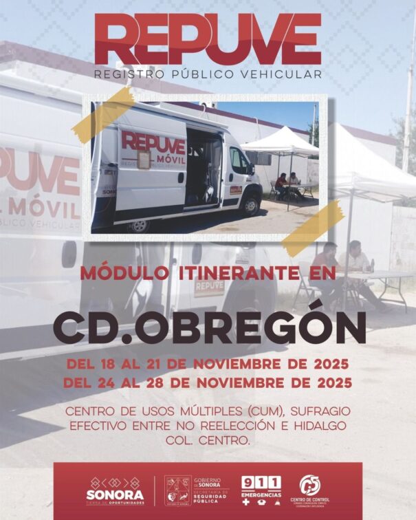 Ciudad Obregón, Sonora; 14 de noviembre de 2025.- En apoyo a las y los habitantes de Ciudad Obregón interesados en realizar el trámite de regularización de autos usados de procedencia extranjera, se instalará el módulo itinerante del Registro Público Vehicular (Repuve) durante dos semanas, informó la Secretaría de Seguridad Pública (SSP) en Sonora.