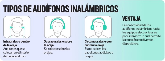Según la Profeco, hay tres tipos de audífonos inalámbricos: Intraurales (audífonos que se colocan en el interior del canal auditivo), supraaurales (se colocan sobre las orejas) y los circumaurales (cubren los pabellones auditivos u orejas).