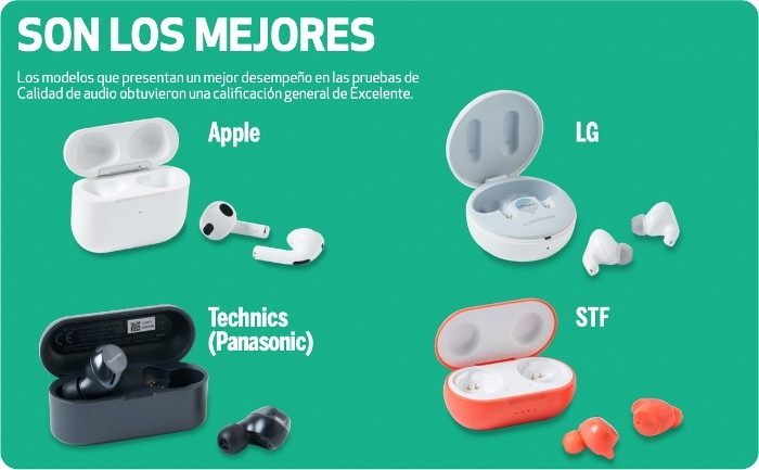 Los audífonos inalámbricos con mayor calidad de audio son los Apple, LG, Technins (Panasonic) y los SFT.