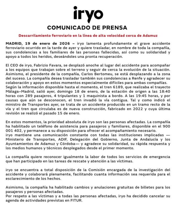 iryo indicó que está a total disposición de la Comisión encargada de la investigación del accidente y que colaborará plenamente, facilitando toda la información que sea requerida para el esclarecimiento de los hechos. La compañía reconoció además la labor de los servicios de emergencia que participaron en las tareas de rescate y atención a las víctimas.