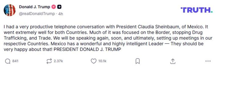 “Tuve una conversación telefónica muy productiva con la presidenta de México, Claudia Sheinbaum. Fue muy positiva para ambos países”, indicó.