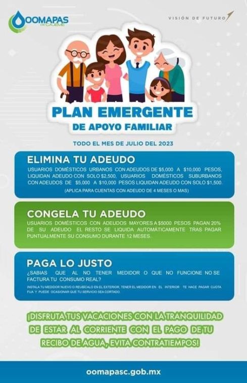 Les recordamos que este PLAN EMERGENTE DE APOYO FAMILIAR, tiene vigencia de lo que resta el mes de Julio, así que invitamos a que se acerquen al Organismo de OOMAPAS DE CAJEME para solucionar ese adeudo o con un retraso de 4 meses, usted puede regularizarse y deja tu recibo en ceros!